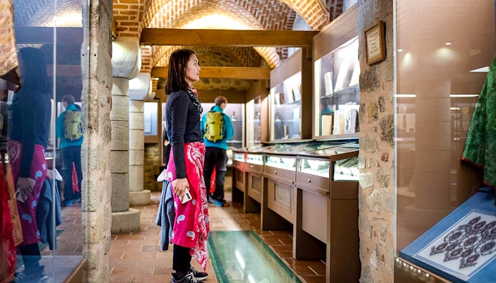 Nej. Den stejle trappe på og den smalle indgangssti gør klosteret utilgængeligt for kørestole eller barnevogne.
