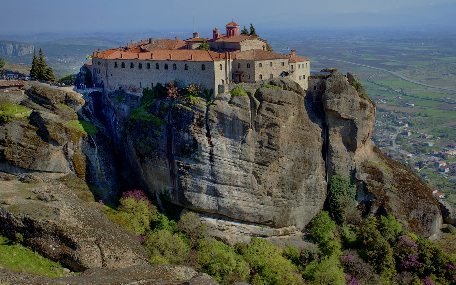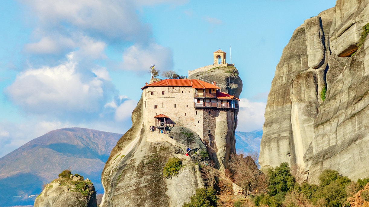 Meteora é um Patrimônio Mundial da UNESCO, onde seis mosteiros ficam no topo de torres de arenito esculpidas ao longo de milhões de anos. Durante séculos, a única maneira de subir era por meio de uma cesta de cordas, içada manualmente e substituída, como diz a lenda, "somente quando o Senhor permitia que se rompessem". A subida hoje é muito mais fácil, mas a mesma sensação de admiração ainda permanece no silêncio entre os penhascos e as paredes centenárias acima.